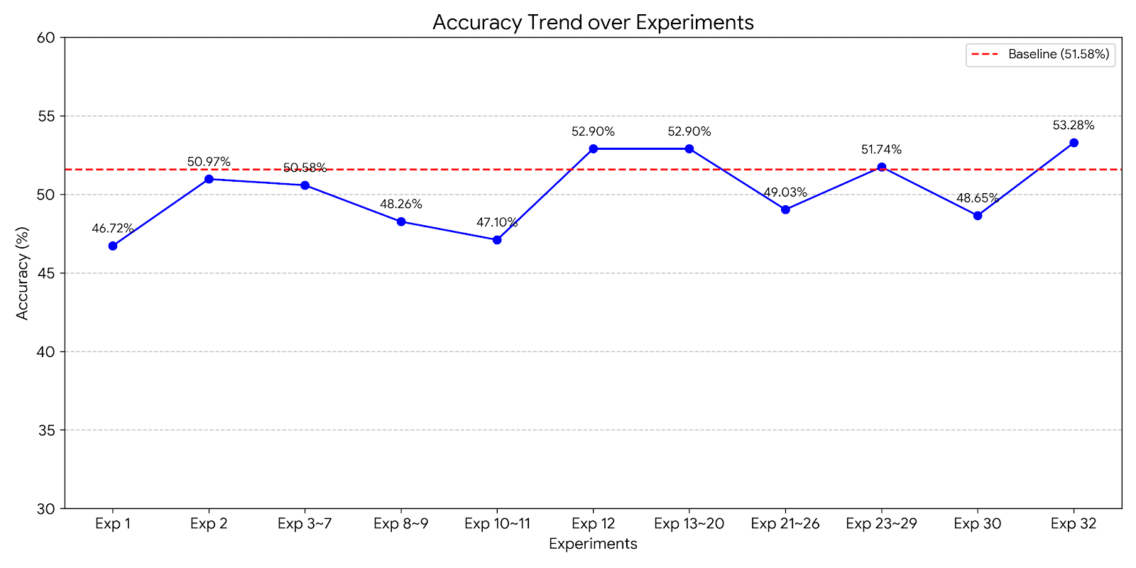| 12 | 프롬프트/스키마 간소화 | 52.90% | Baseline 첫 돌파 |